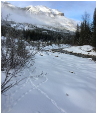 Vermilion RiverWe reached the bottom of the Fire Guard and much to our surprise found that others had crossed the Vermilion River on an ice bridge previously! We had already passed a similar crossing accessed from Hwy 93. Ah, but they wouldn’t have had the challenge of bushwhacking… As we were in the very upper reaches of the Vermilion, the river was not wide and was shallow, although it certainly had gathered more flow by the footbridge at the Stanley Glacier trailhead where we had started from.