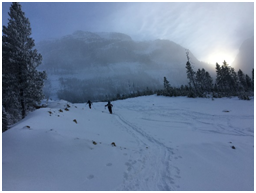 It was cold gearing up in the parking lot, but those finished first found a sunny spot by the Parks Canada sign. A group photo was taken and then Bill’s iPhone went into hibernation for the rest of the winter. On the ski in on the hard pack, Ivan entertained us by teaching us more guide logic. You might think a guide is just being chatty, but every time a guide meets someone coming out of the back country they inquire about conditions. An outgoing snowboarder told us that the slopes at the head of Boom Lake had already avalanched. Avalanche conditions were moderate as Bill recalls, but with persistent slabs and deep buried slabs being the main considerations along with terrain features to be cognizant of.  Along the way in, Ivan stopped and asked how many avalanche slopes had we already crossed. Turns out we had crossed one already while in the trees. This led to a lively discussion about runout slopes, tree scarring, etcetera. We reached the end of the hiking trail and skied onto Boom Lake which was just gorgeous. Of course no photos could be taken. Ivan shared the 10% angle rule of thumb for judging the extent of the runout zone.
