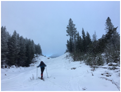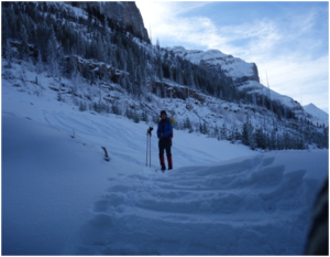 Our speedy and incident-free descent, (even though we encountered what Kelly called a ‘dipsy doodle), from Elk Pass to the hut followed the road as the snow conditions on the trail were a bit dodgy.