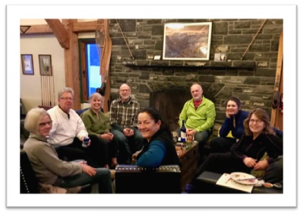 A tradition on the ski trips is to share a meal together. A wonderful array of appetizers before supper served in the lounge and then supper. What a feast! Lasagne, spanokopita, salad, tabouli, a beautiful variety of dessert treats and excellent wines made for a wonderful meal. After the meal we “retired” to the lounge area, got a beautiful fire going and thoroughly enjoyed the company and conversation. Not too much later the good food and the activity of the day caught up to most of us and off to bed.