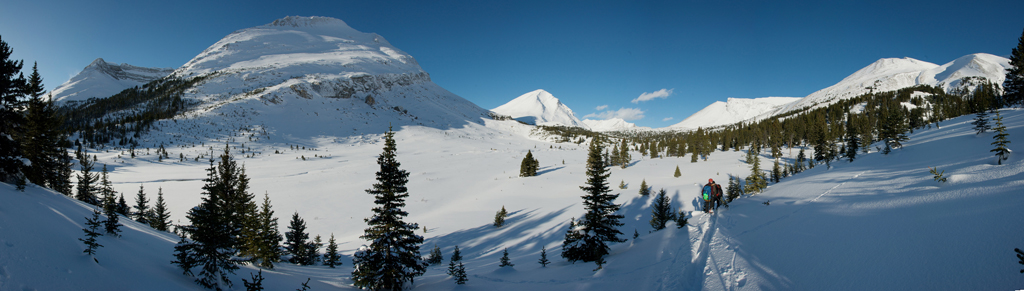 Moraine lake road in Banff National Park closes in early fall and does not require a lot of snow coverage to make it skiable. The road offers several kilometers of track-set skiing and an easy downhill on the way back.