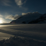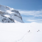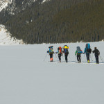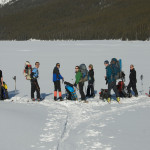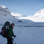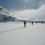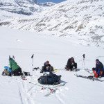 Friday morning at 9:00 am nine members of the club loaded up packs and pulks at the big bend in Highway 93 and headed over the hump and onto the long approach to the Saskatchewan Glacier for the clubs final tip of the season.