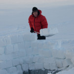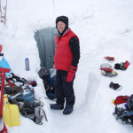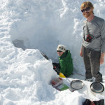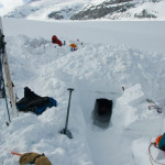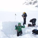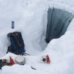 Skiing up the glacier we had spotted several potential areas up on the meadows that offered great potential for snow caving but found no suitable drifts below the moraine. Out came the probes and we found a location with some deep snow pockets and decided to build a hybrid snow cave/quinzee. The plan was to dig down as deep as we could and pile the snow, then dig in and up creating a heat trap in the sleeping chamber. I really missed having a drift to dig into where you can let gravity haul your tailings away but having pulks along saved the day! We broke into two groups and began excavating our homes for the next two nights. Some worked as moles digging while others worked as mules hauling sleds full of snow out of the pits.