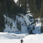 The exit ramp was a mix of wind loading over ice crust over rotten snow topped with a nice cornice so we backed off and started looking for an alternate route with fewer hazards. We looked at a couple of other options but most were plugged with pretty sizable cornices so we made the decision to switch to Plan B and camp below the meadows then look for a safer route the next morning.