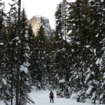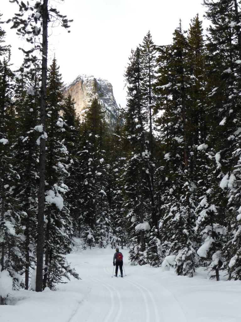We stopped in a lovely open area by Pipestone Creek and soaked up the sunshine and warm weather, looking up at the Lake Louise ski area as we ate lunch. We skied and enjoyed the beautiful scenery for the rest of the afternoon. Dianne Rasmussen stopped along the trail to take a picture and disappeared when she stepped off the trail into the deep powdery snow! All we could see was her green pack wiggling in the snow from a distance! She was helped out and off we were again.