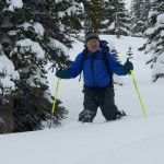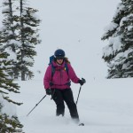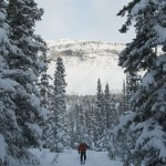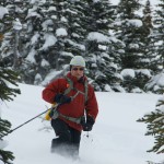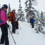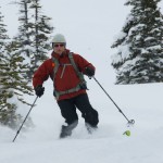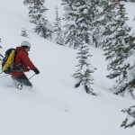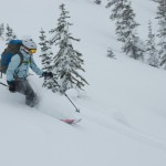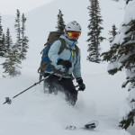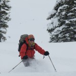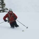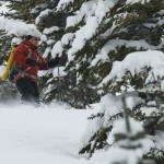 The already high avalanche conditions went higher with the new snow load so we navigated cautiously across Parkers Ridge looking for some low hazard, skiable terrain. On our way up for our second lap we were caught by Nigel from the Ramparts crew and my heart lifted as I thought they had finally made it up the road. Nigel quickly filled us in on the details of trucks and tire chains and let us know that it was unlikely that anyone else would make it up the road unless they plowed it. MORE POWDER FOR US!!!