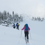 More snow fell overnight, we packed none essential gear and we made a call to Parks Canada over the satellite phone to see what their plan was for the day. Parks planned to start avalanche control asap but were not confident that they would have the highway open before 2:00 PM. We went skiing.