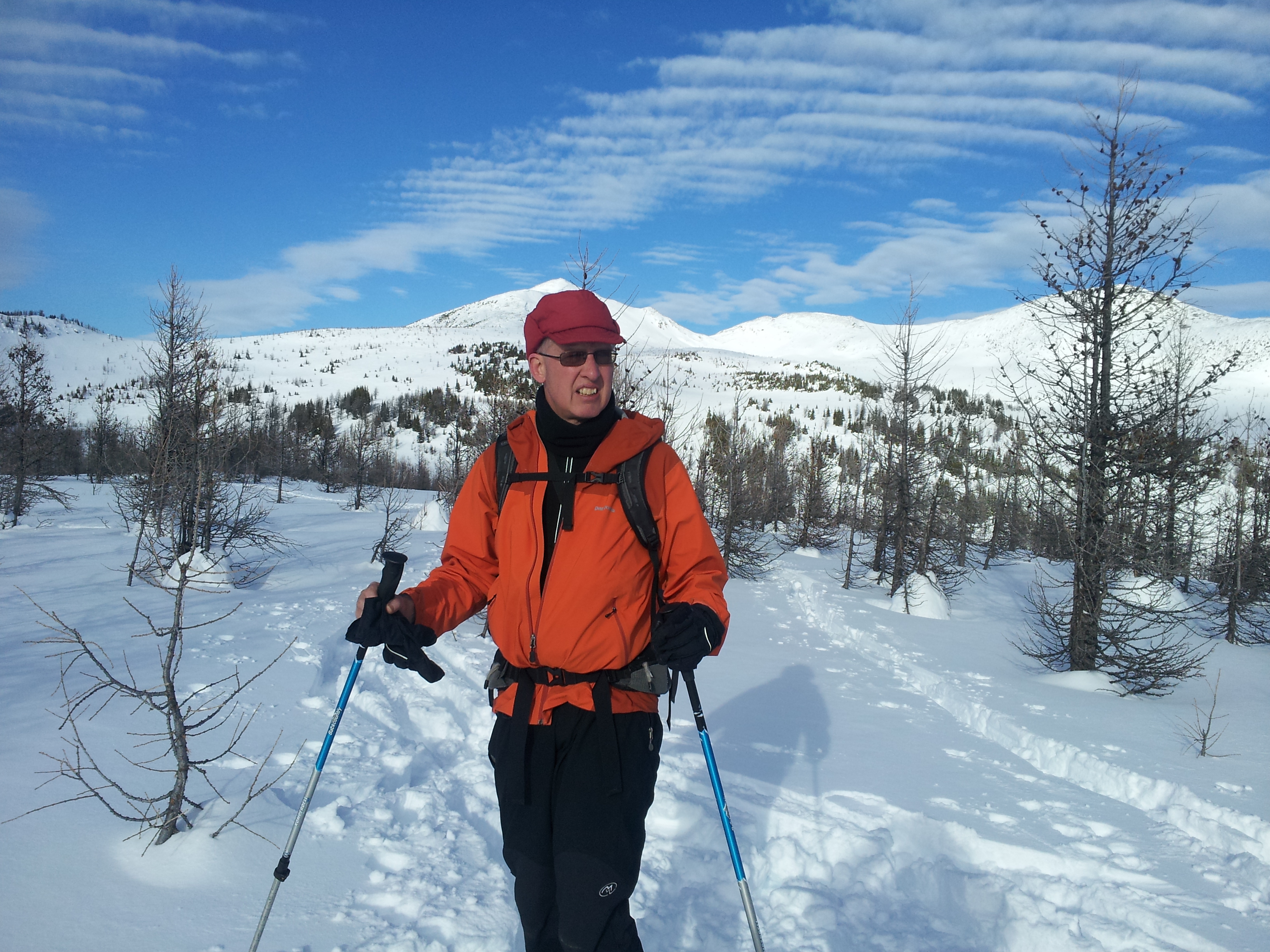 George, Margo, Dave, Ivan and Dion got together for visiting and updating on Friday night. On Saturday the day started with poor road conditions, noting of a couple of accidents and congested traffic making the beginning of the day a bit worrisome. The group was the first on the trail with a couple cm of new snow at trailhead making for nice uphill ski on warm sunny day. The uphill trip was interrupted only by the noise from Sunshine’s frequent avalanche control activities. Lunch was in sunny meadow with gentle warm breeze keeping temperatures perfect.