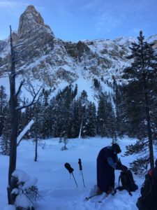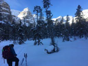 It was cold gearing up in the parking lot, but those finished first found a sunny spot by the Parks Canada sign. A group photo was taken and then Bill’s iPhone went into hibernation for the rest of the winter. On the ski in on the hard pack, Ivan entertained us by teaching us more guide logic. You might think a guide is just being chatty, but every time a guide meets someone coming out of the back country they inquire about conditions. An outgoing snowboarder told us that the slopes at the head of Boom Lake had already avalanched. Avalanche conditions were moderate as Bill recalls, but with persistent slabs and deep buried slabs being the main considerations along with terrain features to be cognizant of.  Along the way in, Ivan stopped and asked how many avalanche slopes had we already crossed. Turns out we had crossed one already while in the trees. This led to a lively discussion about runout slopes, tree scarring, etcetera. We reached the end of the hiking trail and skied onto Boom Lake which was just gorgeous. Of course no photos could be taken. Ivan shared the 10% angle rule of thumb for judging the extent of the runout zone.