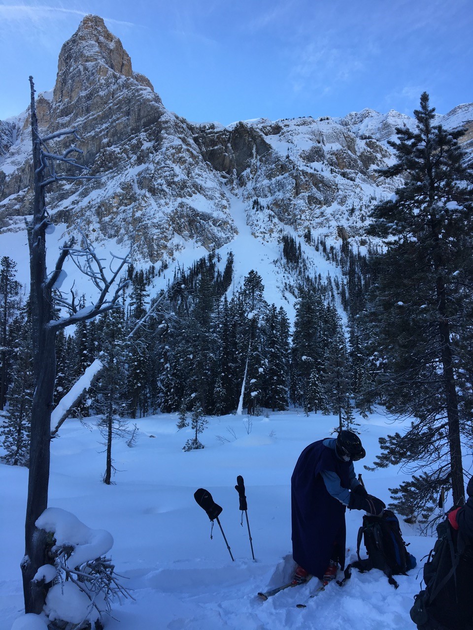 Lunch was quick, and eaten standing up, as we were still in the shadow of the mountains. One of the party expressed a desire to look for a sunny spot, but this didn’t happen. Bill amused the group by pulling out his trusty thermometer, which registered – 23.5° Celsius air temperature and – 23  ° C snow temperature. Unfortunately, it was too cold for Bill’s iPhone to capture the image for the trip report. Not soon enough for some folks, Ivan donned his signature poncho and led us back down the valley to catch up to those skiers who had already begun the ski out.
