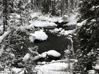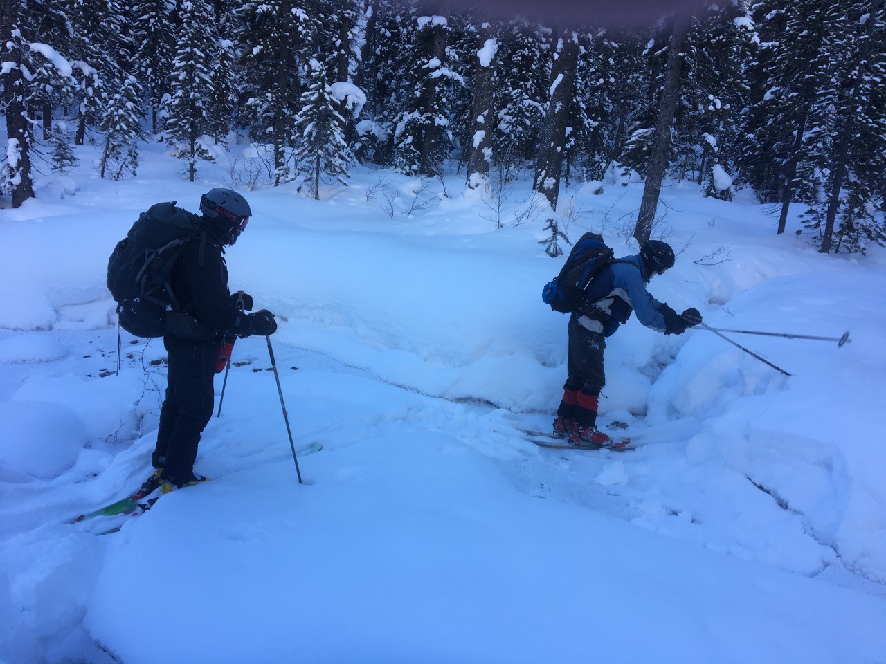 Our speedy and incident-free descent, (even though we encountered what Kelly called a ‘dipsy doodle), from Elk Pass to the hut followed the road as the snow conditions on the trail were a bit dodgy.