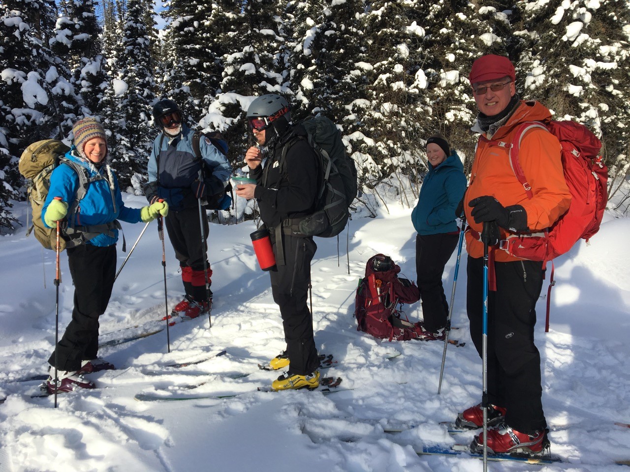Light snow made Sunday’s ski even more enjoyable.  We had ample energy, fuelled by unbelievable breakfast pancakes courtesy of Kelly and Richard.  Cookies from Kelly plus Tim Tam biscuits, (famous Australian cookies, guaranteed to help you cope with Aussie accents and humour), at Elk Pass ensured that everyone’s energy levels were appropriate for the descent.  Four Tim Tams could be deemed excessive, but we all agreed tour leaders burn up lots of energy, especially when they are in hiking boots trying to keep up with skiers…