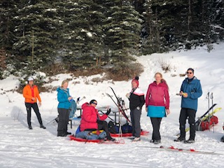 We were led by Ivan D. and assisted by Dion B., with Amanda B., Margo and George C., and Bill F. rounding out the complement. The trail was firm, having been packed down by various users including snowshoers. Eventually Ivan deviated from the hard pack to the left hand side of the valley, leading us on a trail-breaking exercise through the trees. Dion took a turn breaking trail and finding a path, and when it was Bill’s turn he remembered how much work breaking trail through deep soft snow really is. Ivan enriched the sharing of his knowledge of many years of back-country skiing by telling us how guides think and what they do for their clients. A guide will lead his or her clients directly across a frozen creek by sidestepping down the bank (and in so doing preparing an easier surface for climbing back up on the return journey). A guide will bring down snow on the opposite bank if need be with his or her ski poles so the clients have an easier time climbing up. Being a guide is hard work! We eventually found our way out of the trees and joined a main trail along the creek bottom. As the valley opened up with views of the surrounding peaks, we continued upstream until we reached the lunch spot. I think we overshot by about 10 m according to Ivan’s GPS.