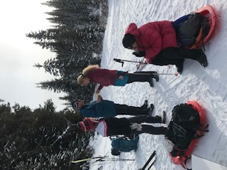 Past the Warden’s cabin and hitching posts we climbed, warmed up by our exertions. Dave and Barb led the way, with Linda as the assistant TL acting as sweep. What a pleasant surprise it was to round a corner and find Dave and Barb enjoying the warmth, sunshine and a snack in a little sun pocket! Bill pulled out his thermometer and it read minus 5! In the snow it read minus 2. Just a beautiful little spot with a long south facing approach, backdropped by large conifers and no wind.