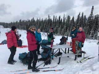 Saturday’s ski to Elk Lakes Hut was 12km with a few rest stops, one at the Blueberry Hill Trail picnic table to refuel, check the pulks and put on/pull off skins.