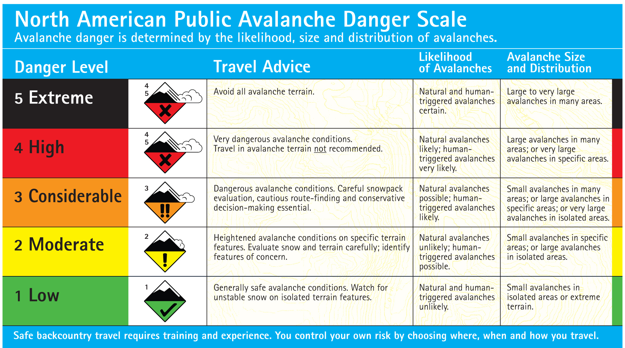 | Complex (Class 3) | Exposure to multiple, overlapping avalanche paths or large expanses of steep, open terrain. Minimal options to reduce exposure. Complicated glacier travel. |