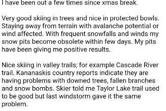Nice skiing in valley trails, for example Cascade River trail. Kananaskis Country reports indicate they are having problems with downed trees, fallen branches and snow bombs. Skier told me Taylor Lake trail used to be good but last windstorm gave it the same problem.