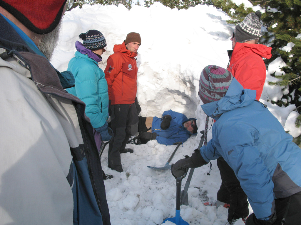 Tour leaders practice team shoveling to recover a buried “victim“