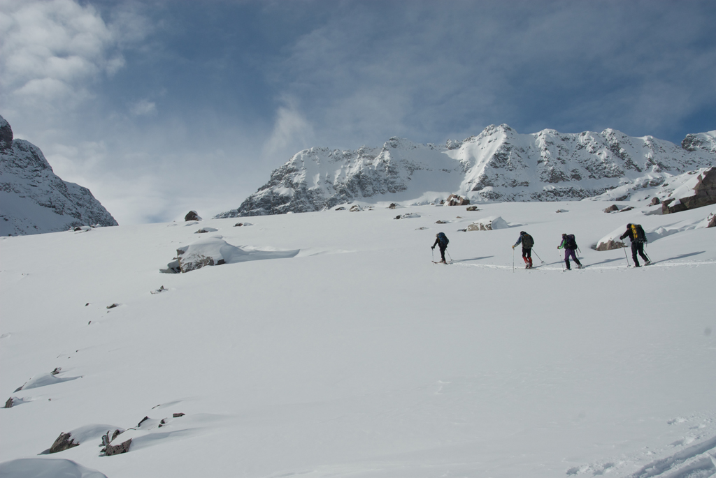 Vance, Margo, Derry, Ivan and I loaded heavy packs and pulks at 9:00 am Friday morning and headed across the frozen Athabasca river and quickly joined up with the Fryatt Valley Trail. The lower section of trail is fairly flat and meanders through the woods offering the occasional glimpse of the Endless Chain Ridge to the east and Mount Christie to the south. Another group had been in the previos week and left a nice track and we had to do minimal trail breaking.